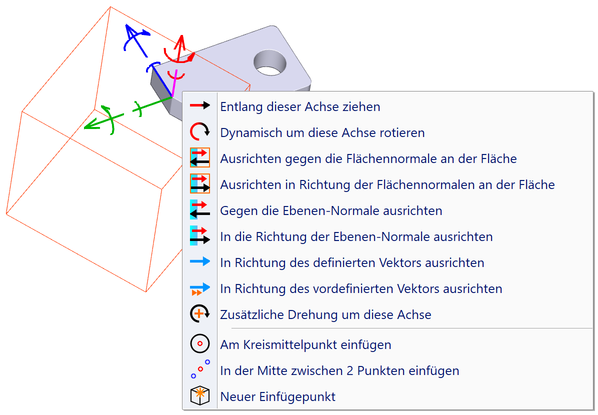 Ein weiterer Vorteil der zusätzlichen Rotation liegt darin, dass das Objekt über eine Kombination von Drehungen um mehrere Achsen an jede beliebige Ausrichtung im Raum gebunden werden kann, unabhängig vom ursprünglichen Achsensystem. Die Objekte werden immer an die Richtungen der X-, Y- und Z-Achse gebunden, diese Richtungen hängen aber davon ab, wie das Solid erzeugt wurde und können in bestimmte Situationen sehr ungünstig liegen. Mit zusätzlichen Drehungen um die gewünschten Achsen kann das Objekt exakt ausgerichtet an eine Position gebunden werden.