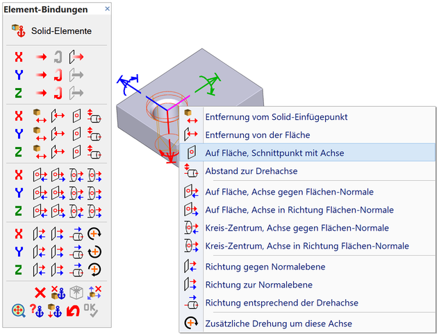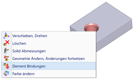 Auswahl einer Bindungsdefinition über das Kontextmenü für das erkannte Element (Bohrung)