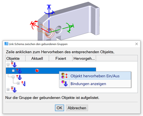 Die gebundenen Objekte werden im Schema angezeigt. Dieses Schema stellt alle Abhängigkeiten grafisch dar – die gesamte Kette der Abhängigkeiten wird angezeigt. Vor der Objektwahl kann eine Bindungsgruppe wahlweise hervorgehoben werden – damit wird exakt vorher angezeigt welche Objekte für die Anwahl gewählt werden. Alternativ kann auch ein Objekt im 3D angeklickt werden und wenn es gebunden ist, wird es ich Schema und im Raum hervorgehoben.