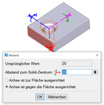| Entfernung zum Einfügepunkt des Solids. Die Position des gebundenen Objektes ist in einem definierten Abstand zu einem gewählten Objekt (anderes Solid-Element) fixiert. Der Abstand kann positiv oder negativ (in Richtung oder entgegen der Achsenrichtung) oder Null sein. Diese Zwangsbedingung wird häufig für Abstände von Bohrungen oder anderen Solids verwendet. |