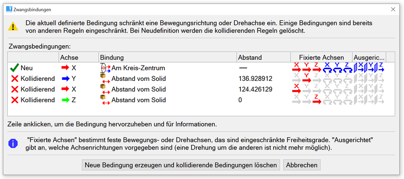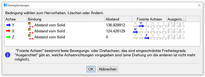 Werden die äußeren Teile des Achsen angeklickt, können die entsprechenden Bindungen gelöscht werden (siehe oben). Wenn eine gewählte Achse von Zwangsbedingungen befreit werden soll, wählen Sie folgende Optionen: