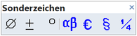 Sonderzeichen können im Maßtext oder in 2D-Texten verwendet werden. Wann immer eine Eingabe notwendig ist, wird eine Werkzeugleiste mit Sonderzeichen eingeblendet. Das jeweilige Zeichen kann durch Anklicken des entsprechenden Symbols eingegeben werden.
