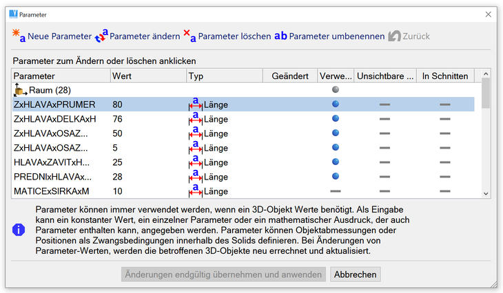 Diese Funktion ermöglicht das Arbeiten mit allen Parametern im aktuellen 3D Bereich und Baugruppen. Man kann: