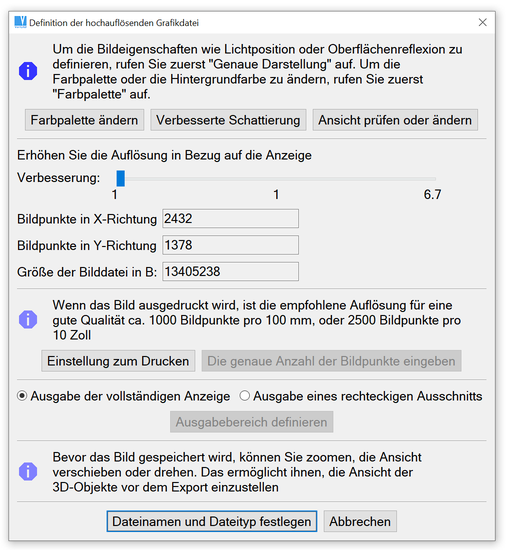 Bevor das Bild erzeugt wird, können die Objekte überprüft werden, die innerhalb des Ausgabebereichs angezeigt werden (gesamtes Fenster oder rechteckiger Ausschnitt). Die Anzeige kann abschließend mit den Standardfunktionen wie Zoomen, Verschieben, Rotieren angepasst werden. Soll die Anzeige nicht in der Standarddarstellung ausgegeben werden, muss vor der Ausgabe der Bitmapdatei die "Verbesserte Schattierung" (für Perspektive, Lichtposition, etc.) eingestellt oder "Farbpalette ändern" ausgeführt werden.