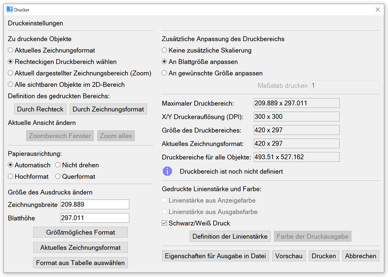 Standardmäßig ist die Blattgröße identisch mit dem Zeichnungsformat, oder die maximale Größe die der Drucker erlaubt. Es gibt folgende zusätzliche Blattgrößen-Optionen: