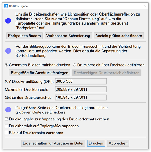 Im 2D-Modus wird nach Wahl des Druck-Kommandos der 2D-Bereich gemäß der Drucker-Ausgabe Einstellungen ausgedruckt. Im 3D-Modus werden schattierte oder Objekte im Drahtgittermodus gedruckt. In diesem Fall ist die Verwendung der Verbesserten Schattierung und ein komplett weißer Hintergrund angebracht - ähnlich, wie auch für die Ausgabe von Hochauflösenden Bitmaps der Fall ist - siehe Hochauflösende Bitmaps.