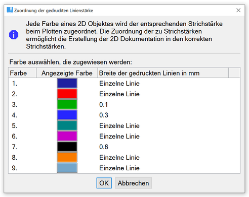 Wenn Sie einen Farbdrucker verwenden, können Sie den Bildschirmfarben Druckerfarben zuordnen. Für Standard-Drucker können Sie den Bildschirmfarben verschiedene Linienstärken zuordnen. Das Ergebnis ist unterschiedlich, wenn zuerst die Linienfarben zugeordnet werden. Die Einstellungen zur Linienstärke und Zuordnung der Linienfarben kann entweder in den Druckereinstellungen oder über das Kommando CFG im 2D-Abschnitt festgelegt werden.