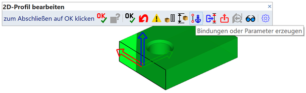 Falls mit Zwangsbedingungen und Parametern in Profil-basierten Solids gearbeitet werden soll, muss ein Solid zuerst zum Bearbeiten angewählt werden. Danach wird das entsprechende Symbol in der Bearbeitungs-Werkzeugleiste angeklickt und der Bearbeitungs-Modus wird in den Modus für "Solidprofil Bindungen" umgeschaltet. Nach einer erfolgten Anbringung von Zwangsbedingungen wird beim nachträglichen Ändern immer in den Modus für "Solidprofil Bindungen" umgeschaltet, man kann in den Modus zum Bearbeiten der 2D-Profile durch Anwahl des Icons "Profil bearbeiten" in der Werkzeugleiste zurückschalten.