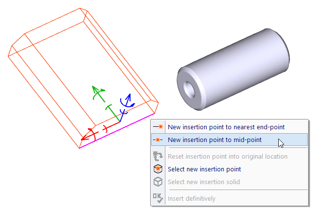 When locating a solid in 3D space, it is placed by its insertion point. The insertion point of each solid is defined during the solid creation. When solids are joined together, the default insertion point becomes the point of the object to which the other object is added (the root solid). When inserting multiple objects, the insertion point of the first selected object is used. You can redefine the insertion point location at any time.