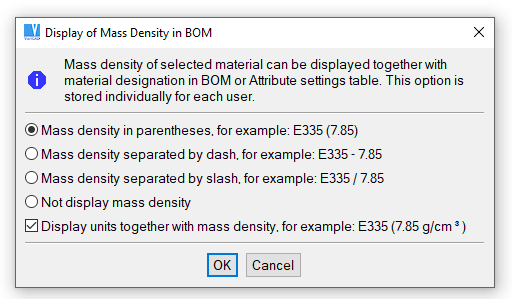 Mass density is stored for each solid together with material. If a mass of an assembly is calculated and different materials of different parts are used, the calculation copes this correctly. If some or all solids have no material defined, mass calculation asks for mass density. Then, entered value is used only temporarily for the calculation.