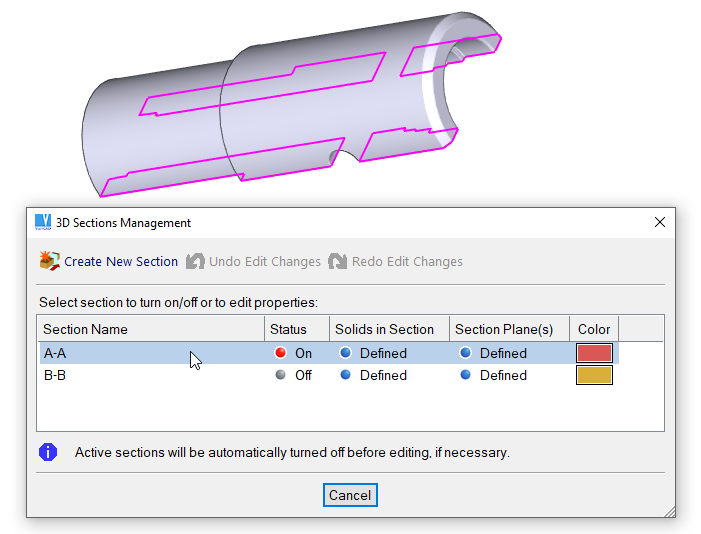 Turns on or turns off selected section. Allows you to define a new section, define the sectioned solids, section planes or cancel definition of 3D section.