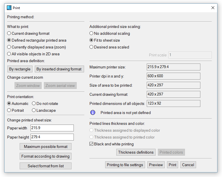 カラープリンターを使用している場合、表示している色を印刷したい色へ変更できます。スタンダードなプリンタでは、表示している色ごとに、印刷する線の太さを変更できます。はじめに色を変更したかどうかで、印刷結果は異なります。印刷設定機能内または、コマンド“CFG”で線の太さと色のマッピングができます。