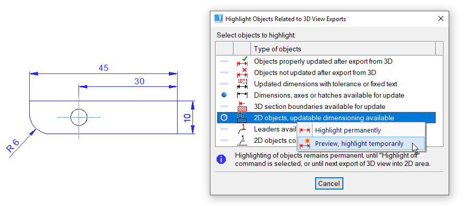 Se os objetos estiverem realçados de forma permanente – no comando descrito acima, ou automaticamente como dimensões não atualizáveis, é possível desligar o realce. O utilizador pode selecionar se deseja desligar o realce em todo o desenho ou apenas na janela de seleção.