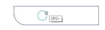 As dimensões de raios ou diâmetros, também são atualizáveis, se o círculo ou arco dimensionado, pertencer a uma vista 3D exportada para o 2D. Os símbolos de acabamento também são atualizáveis, se estiverem localizados num arco ou linha a partir de uma vista 3D. De novo, a deteção de objetos que corresponde a uma dimensão atualizável, é mostrada como UPG+, próximo do cursor.