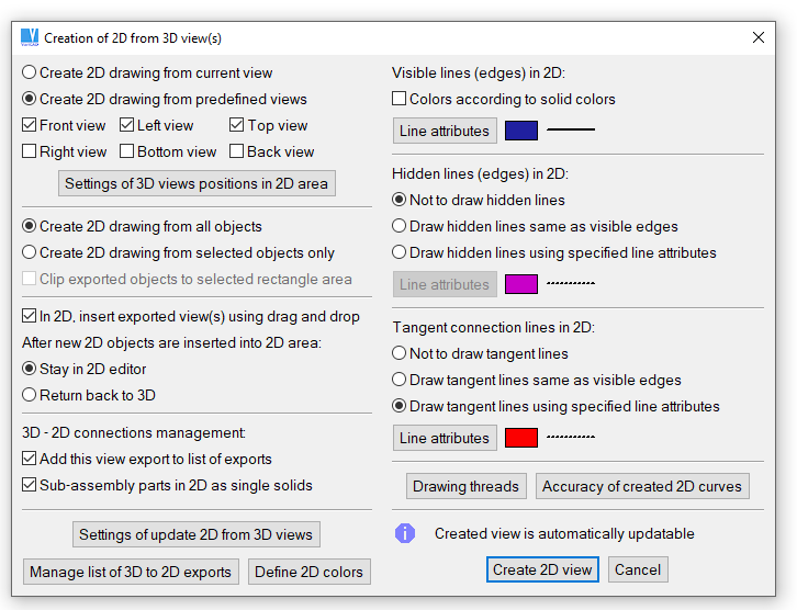 É possível criar desenhos 2D a partir do seu modelo 3D, pela exportação de vistas. Por cada vista exportada, podem ser usados apenas alguns objetos ou todos. Os objetos exportados podem restringidos a um retângulo definido, se for necessário criar apenas um pequeno detalhe de uma peça maior.