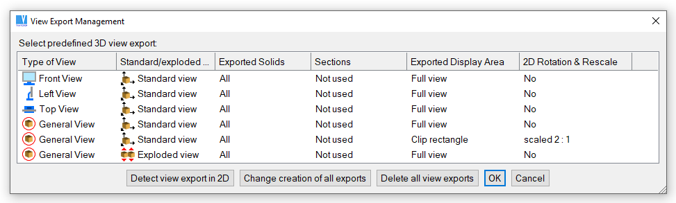 Esta função gere a lista de vistas pré-definidas, exportadas. Esta função está disponível também a partir do Atualizar 2D Após Alterações no 3D ou do Criar 2D do 3D. A exportação da vista pode ser selecionada a partir da lista bem como a partir dos objetos 2D correspondentes. Podemos: