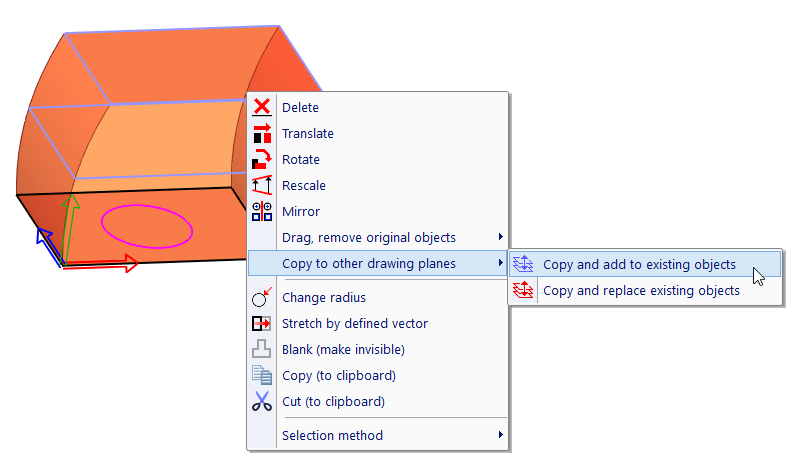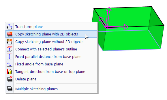 Para copiar objetos 2D entre o resto dos planos de esboço, selecione os objetos. Então faça clique com o botão direito do rato e a partir do menu relacionado, selecione o método de cópia: