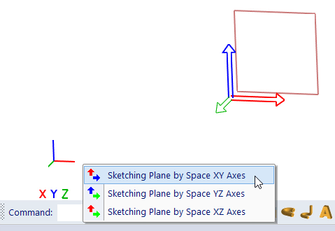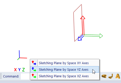 Seleção de eixos. Este menu é mostrado, se o espaço 3D estiver vazio. O plano de esboço que corresponde ao item do menu, é realçado. Os eixos do plano, são mostrados como eixos do plano de esboço e não como eixos globais.