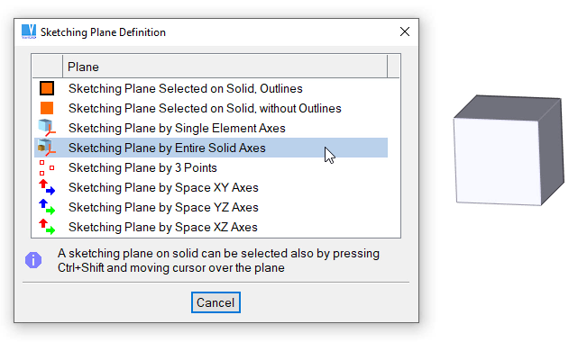 Esta caixa de diálogo é mostrada, se o espaço 3D contiver sólidos. O plano de esboço, pode ser selecionado também, nas superfícies do sólido planar ou nos eixos do sólido.