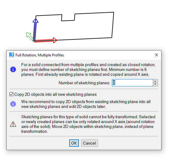 Os perfis usados para os sólidos 3D, devem ser contínuos. Se forem usados vários perfis, estes não se podem intersectar; um perfil deve englobar completamente os restantes perfis. Os perfis usados numa operação de Revolução não podem intersectar o eixo de revolução. As linhas, os círculos ou os arcos podem ser selecionados para todos os tipos de criações sólidas. Se um perfil contiver aberturas ou intersecção de segmentos, pode opcionalmente realçar a localização do erro.