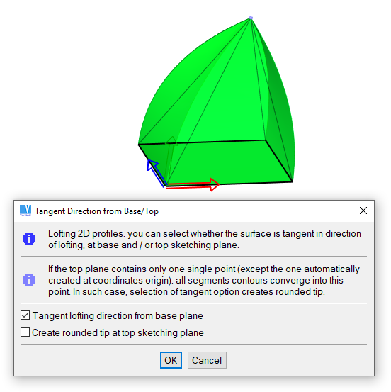 A direção tangente pode ser selecionada para loft a partir do plano base ou do plano de topo. Isto vai provocar que as arestas das superfícies na base e no topo tenham normais perpendiculares ao plano normal. A direção tangente pode ser selecionada independentemente para os planos de base e do topo.