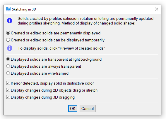 É possível gerir o modo como os sólidos editados são visualizados. Pode ser usada uma visualização em modo de arames, como substituto da transparência, ou o sólido pode não ser atualizado permanentemente.