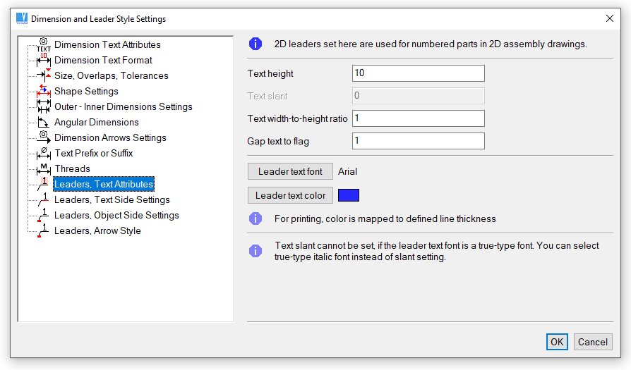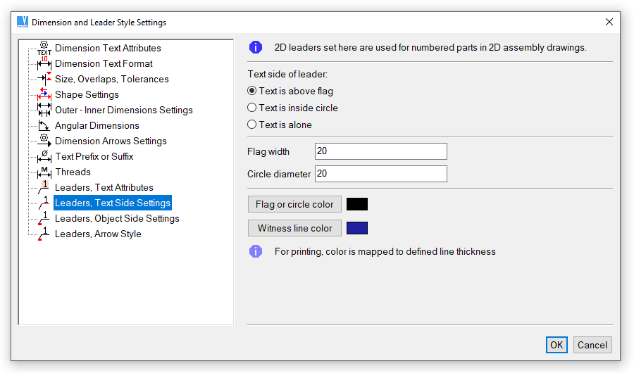 A alteração dos atributos das dimensões, permite a definição do dimensionamento de acordo com os vários standards de desenho, como DIN ou ANSI. Os atributos das dimensões, são usados também para os símbolos de acabamento ou setas de textos simples ou múltiplos.
