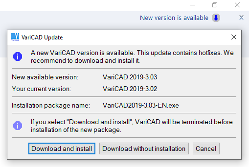 Durante o arranque, o VariCAD vai verificar sempre por atualizações no nosso servidor. Se o sistema detetar que está a correr uma versão antiga, vai ser mostrada uma mensagem no canto superior direito da janela do VariCAD. Clique nesta mensagem e poderá instalar uma nova versão.