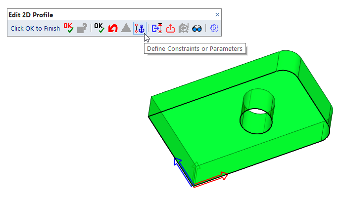 Se for necessário trabalhar com parâmetros e constrangimentos, na criação de um perfil 2D, selecione um sólido para edição. Depois clique no ícone, na barra de ferramentas correspondente – o modo de edição 2D, é trocado para o modo de constrangimento de perfis. Depois de executar a alteração, o perfil é sempre editado em modo de constrangimento. A partir deste, é possível trocar para o modo anterior de edição 2D – clicando no ícone respetivo.