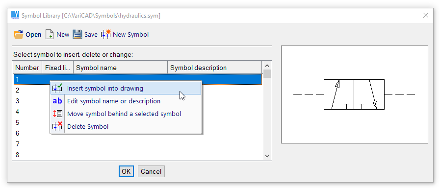 Este comando cria, edita ou elimina símbolos, a partir de uma biblioteca aberta. Se não estiver nenhuma biblioteca aberta, selecione a biblioteca existente ou crie uma nova. Apenas pode estar aberto um símbolo de cada vez. Os símbolos disponíveis do pacote que é distribuído com o VariCAD (como os símbolos pneumáticos ou hidráulicos), são inseridos no desenho, com recurso a métodos diferentes - a partir do menu “Peças”.